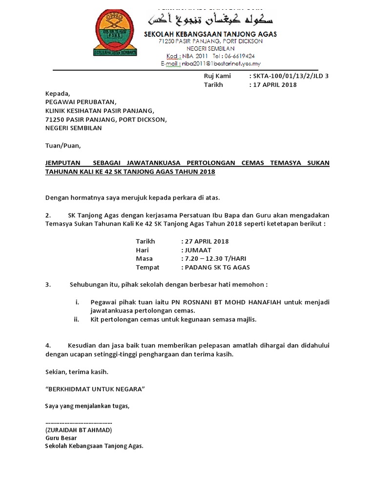 Surat hendaklah ditaip menggunakan komputer Format Surat Rasmi dan bukan tulisan tangan. Tak hanay mmeuat pernyataan.